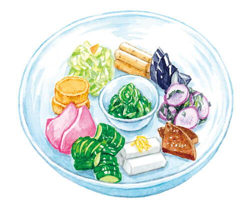 ごぼうの香りと嚙んだときの繊維を割く感じ。絶妙な塩加減。青菜に茄子、白菜。どれもこれも、あとを引く上品な塩加減だ。
