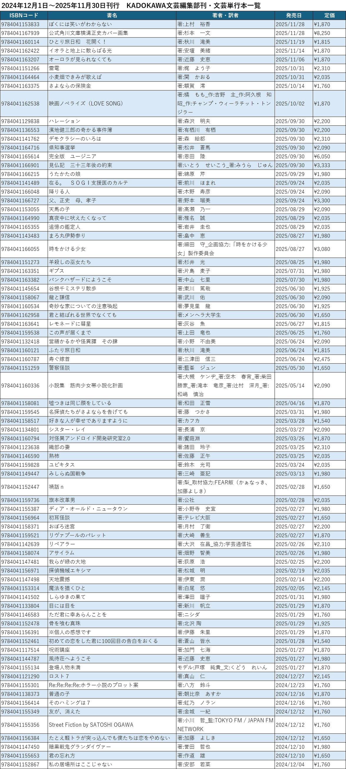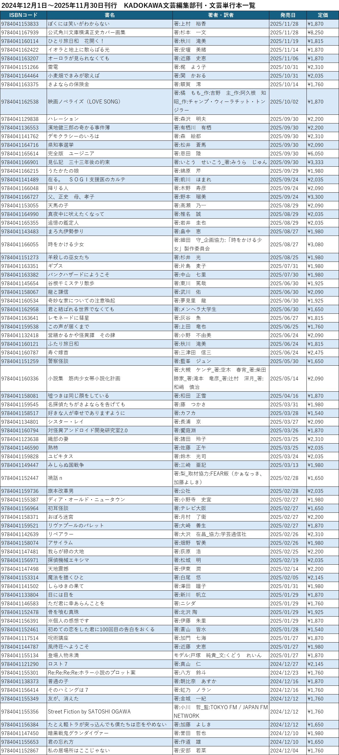 KADOKAWA文芸編集部の文芸単行本一覧(2024年12月~2025年11月)