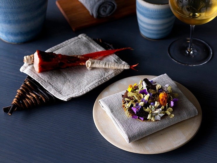 お店のプロデュースや料理開発を手掛けるヘッドシェフのフレベル氏(以下、トーマス)は、ドイツ生まれ。2009年からnomaで働き、2014年に初来日。その後、日本全国を巡り、日本の食材や文化に魅せられ、日本へ移住することを決意。INUAでは、世界中から集まった仲間たちとともに日々新しい料理を生み出す研究を重ねている。野生の果実、ハーブ、海藻などを、トーマスならではの観点でアレンジし、料理に落とし込む。そのこだわりは話題となり、いまでは東京でもっとも注目されるレストランとして話題を集めている。