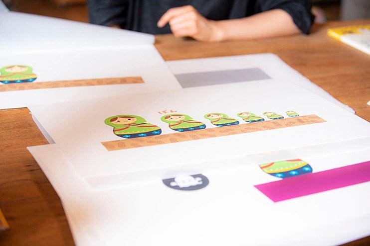 としお:マトリョーシカのページについては、サブキャラとして他の生き物を描くのもちょっと違うなと思って、いろいろ迷ったんです。それで最終的に、マトリョーシカが置かれている台のクロスの柄に変化をつけました。マトリョーシカの形と関連するような模様を、消しゴムはんこを使って描いています。