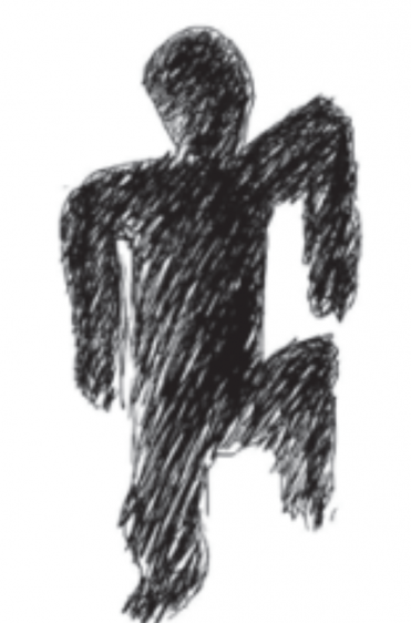 山井:「ライドウ」開発時代に住んでいたマンションの話で、そこは家の前に集合ポストがあるところでした。ある夜、ゴミ出しに行った帰りに、家の前の通りのほうを振り返ったら、ちょうど道の真ん前に、左肩と左足を上げて立っている人がいたんですよ(下段イラスト参照)。