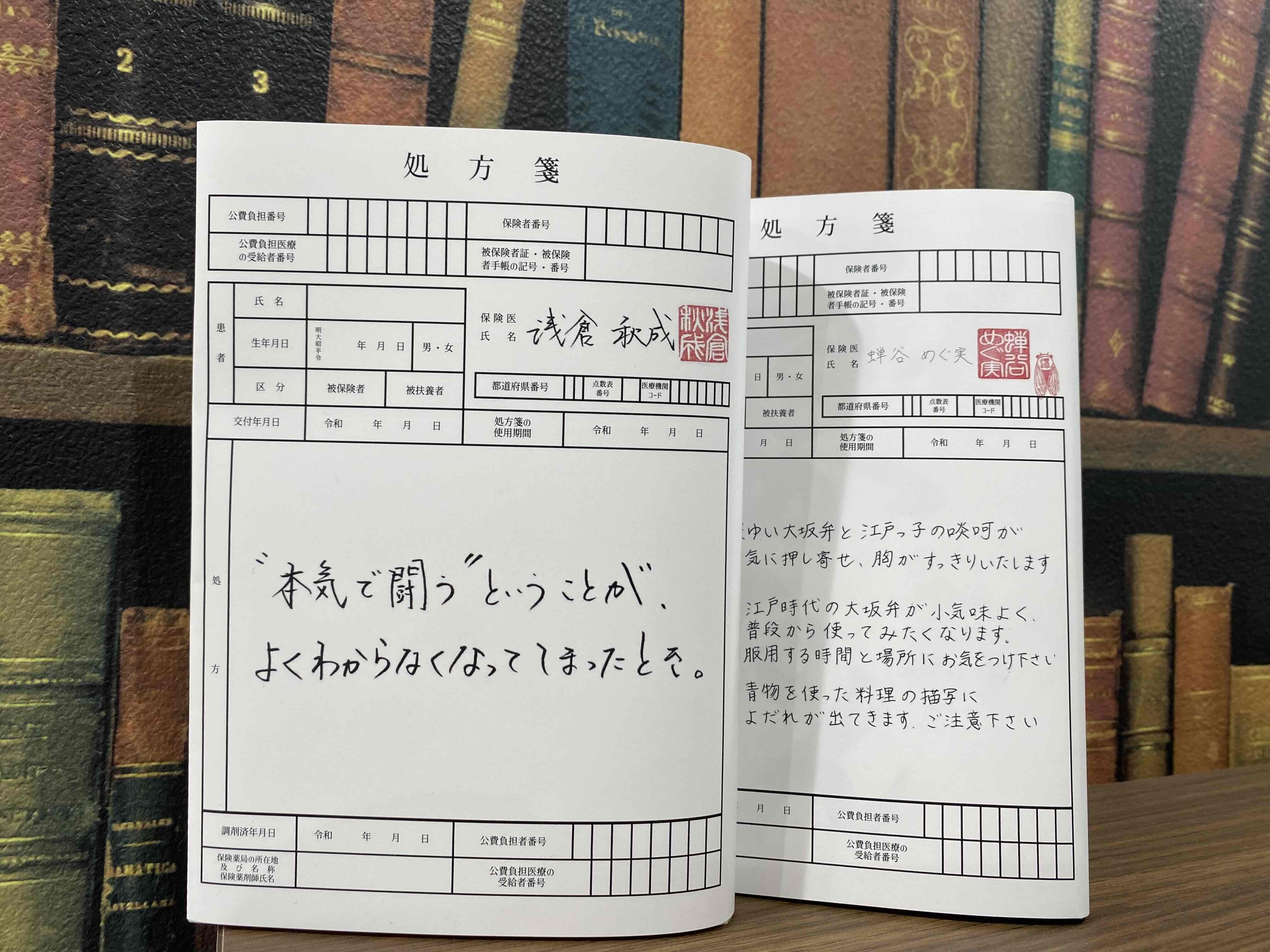 尼子:当初は処方せんをそのまま使うようなかたちで作っていましたが、用法の欄が小さくて見づらかったんです。今回、ブックカバーは、オリジナルブックカバーで有名な正和堂書店さんにご協力をいただいて、バランスよく調整していただきました。一般の方が見て「処方せん」だとわかる情報量はどのくらいなのかなど、いろいろとすりあわせをして、いまのデザインになりました。