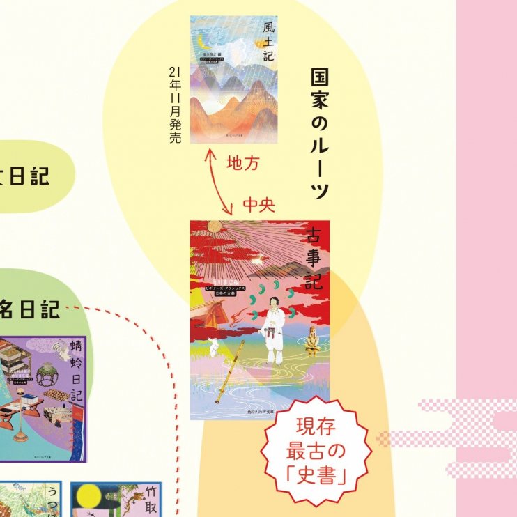 たとえば、『古事記』と『風土記』について。『古事記』を「中央」、『風土記』を「地方」として、対比の矢印をつけました。そして、この二つの作品をつないで、背景に「国家のルーツ」というコメントをつけました。