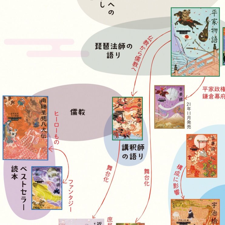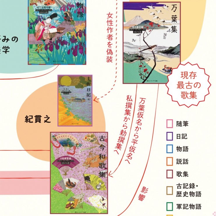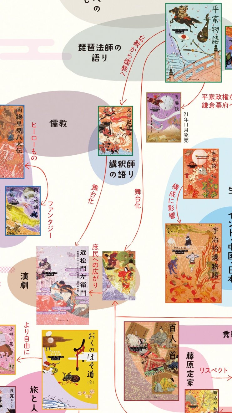 このマップは研究者の方たちにも読んでほしいけど、ビギナーズの名前の通り、古典をあまり読んだことのない人にも届けたいと思い、専門用語は使わず、わかりやすいことばを使うように努めました。矢印にも、背景のグループにも。それでも、ちょっと難しいことばもあるかもしれません。例えば、「