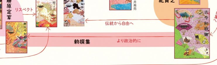 それから、『古今和歌集』(以下『古今集』)から『新古今和歌集』(以下『新古今集』)をつなぐ矢印には「より政治的に」と記したのですが、この二書の関係ももちろんそれだけではありません。