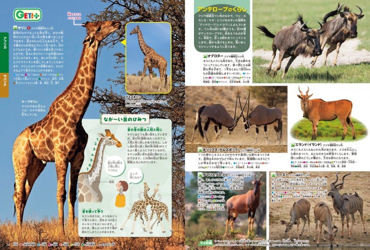 だから動物園でキリンを見てきたら、そこでこの図鑑の出番。キリンのところを見れば、インパラやガゼル、ジェレヌクなど、同じ環境に生息するいろいろな動物が載っています。前後して肉食動物にはどんなものがいるか、どういう関わりがあるかということも載っているので、動物園で見たことをさらに膨らませることができますよ。
