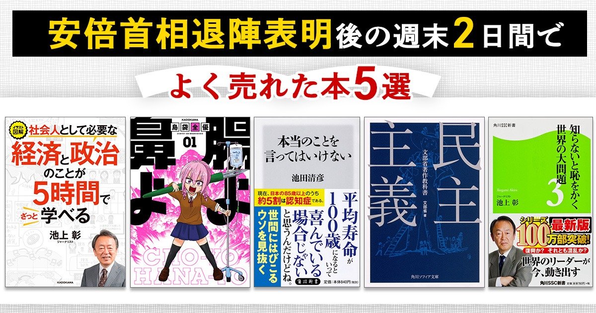 8月28日(金)夕方、潰瘍性大腸炎の再発を理由として安倍首相が辞意を表明しました。この報道を受けて、翌29日(土)、30日(日)はそれまでとは違う本が一気に販売数を伸ばしています。インターネット上では「安倍晋三」や「首相退陣」で検索した人も多かったというデータもあり、この週末2日間の販売ランキングは興味深い状況となりました。この販売ランキングから上位書名5点について紹介します(弊社調べ)。