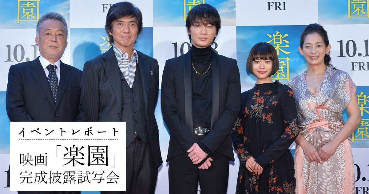 最後に綾野が「いままで映画に携わってきて、皆さんに伝えたい、何かを感じてもらいたいと作品を作ってきました。だけどこの作品を観たとき、新しい感情が芽生えました。それは“皆さんに託す”ということです。この映画は、皆さんに託すことで作品が完成すると思いました。たくさんの感情をこの作品に投影してもらえたら幸いです」と真摯に語った。続けて瀬々監督は「限界集落での差別問題などが、この映画の背景にはあります。それをぶち破りたいと思い、作りました。この映画を観て、自分の心の中にある『楽園』を感じてもらえたら、そこから生まれた力がまた新しい力になっていくのではないかと思っています」と締めくくった。
