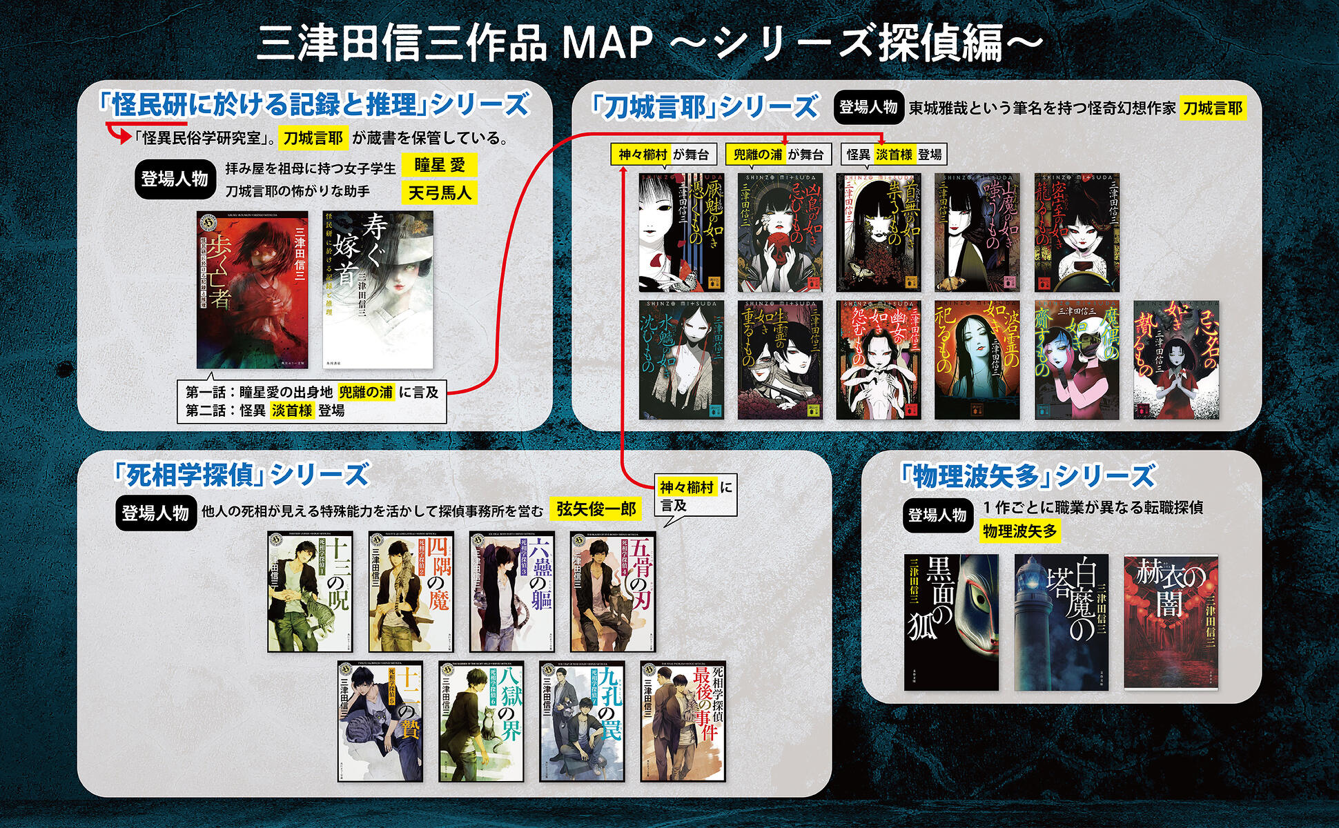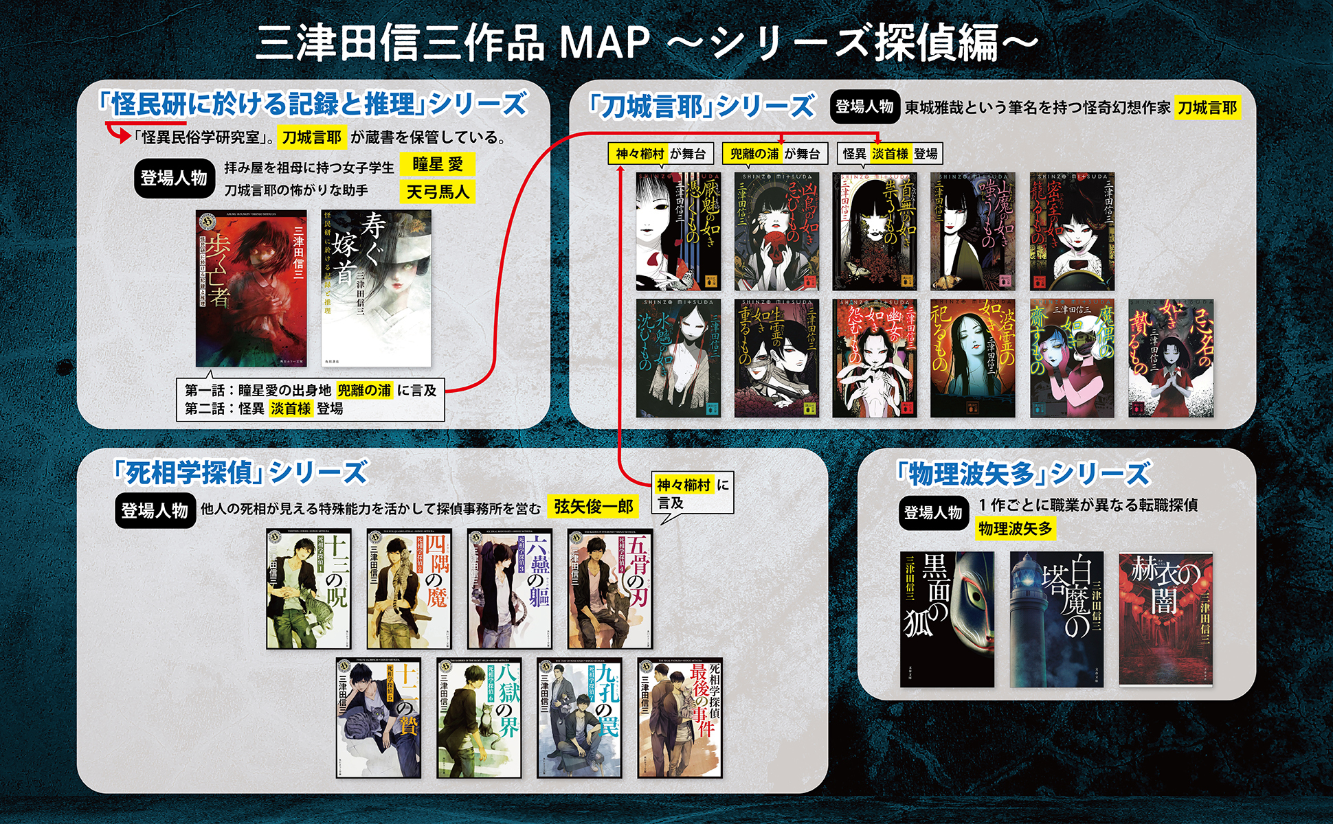これら2つのシリーズの時代背景は昭和20年代後半~昭和30年代前半だが、現代を舞台にしつつ、両シリーズとリンクしているのが「死相学探偵」シリーズである。主人公は、他人の死相が視える特殊能力を活かして探偵業を営んでいる弦矢俊一郎。2008年の『十三の呪 死相学探偵1』に始まり、2021年の『死相学探偵最後の事件』で完結するまでの全8冊から成っている。各作品で起こる事件は独立しているものの、それらの背後に潜む謎の存在「黒術師」と弦矢俊一郎との対決がシリーズの軸となっている。三津田作品の中でもエンタテインメント性を重視したシリーズだ。『五骨の刃 死相学探偵4』で『厭魅の如き憑くもの』の神々櫛村の谺呀治家が言及されるなど、「刀城言耶」シリーズとのリンクは少なくない。「怪民研」シリーズとのリンクについては伏せておくが、興味のある方は『歩く亡者』を読んでいただきたい。