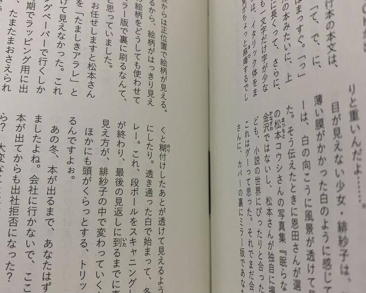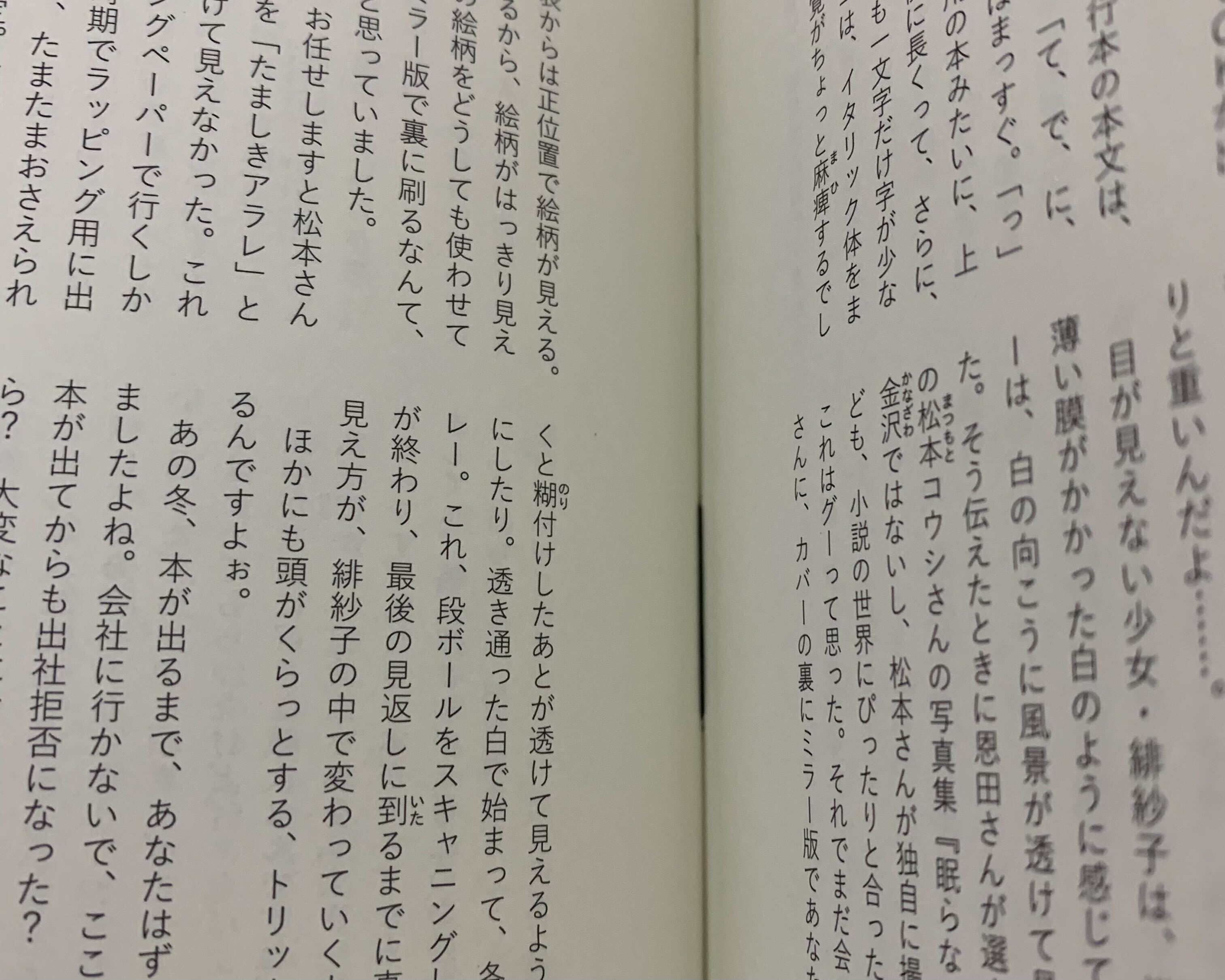 あ、皆さん、気がついていました? 単行本の本文は、時計回りに一度傾いているんですよ。でも、「て、で、に、を、は、へ」だけは、傾いてなくて、ほぼまっすぐ。「っ」や「ゃ、ゅ、ょ」は、戦前戦後の子供用の本みたいに、上の文字にくっついてるの。「、」は、横に長くって、さらに、ページの外側の行は、内側の行より一文字字が少ないの。