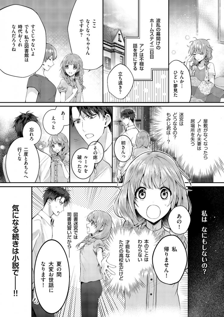 高校生の美原アンが夏休みにホームステイすることになったのは、札幌の郊外に佇む私設図書館、通称「図書屋敷」。不愛想な館主・セージに告げられたルールを破り、アンは真夜中の図書館に迷い込んでしまう。そこは荒廃した裏の世界――“物語の幻影”が彷徨する「図書迷宮」だった!