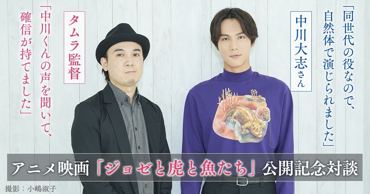 青春恋愛小説の金字塔とうたわれる、田辺聖子さんの短編「ジョゼと虎と魚たち」が劇場アニメ化されました。原作や、2003年に公開された実写映画とも設定が異なり、令和の現在を舞台にした物語です。海洋生物学を専攻する大学生の恒夫と、車椅子のジョゼがひょんなことから出会い、お互い影響を与え合っていく……。夢を抱く若者たちの青春模様と純愛を圧倒的な映像美で紡いだタムラコータロー監督と、声優として恒夫を好演した中川大志さんに今作の魅力や見所について語り合っていただきました。