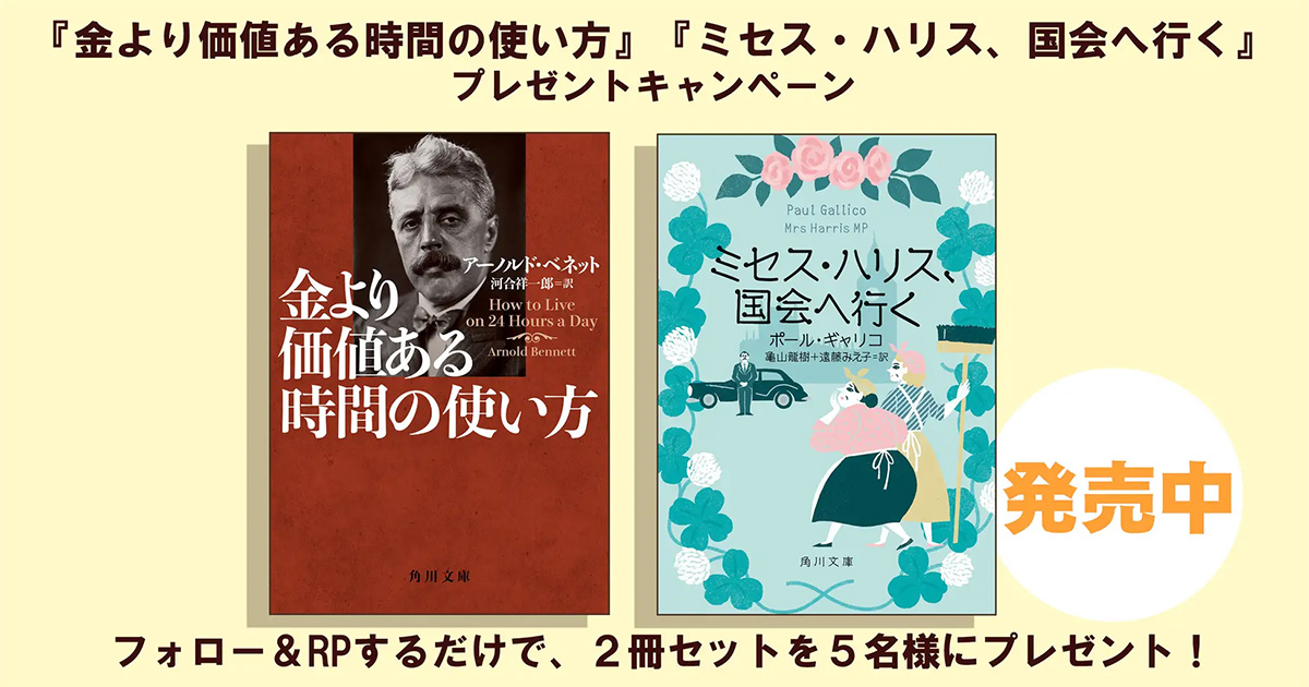 メンタリストDaiGoさんお薦めの人生を変える名著『金より価値ある時間の使い方』と映画化もされた大人気の家政婦さんシリーズ第3弾『ミセス・ハリス、国会へ行く』が、先月、角川文庫より発売されました。それを記念して、2024年1月16日(火)12:00よりX(Twitter)で書籍のプレゼントキャンペーンを行います。