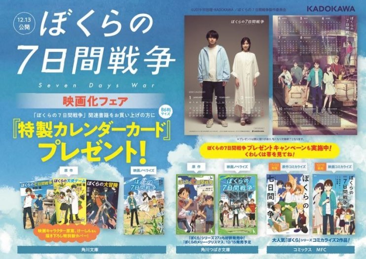 シリーズ累計では2000万部を超える宗田理 著「ぼくらの七日間戦争」のアニメ映画が12月13日(金)に公開されます。映画化に当たり、「ぼくらの7日間戦争」の関連書籍をお買い上げの方に、『特製カレンダーカード』(B6判サイズ)をプレゼントするフェアを行っています。『特製カレンダーカード』は、キャストの北村匠海さん、芳根京子さんの写真や、映画キービジュアルを使った限定品です。