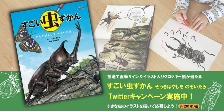 「ゆるふわ昆虫図鑑」の作者・じゅえき太郎さん(漫画家・イラストレーター)の絵本『すごい虫ずかん』と、「虫のイラスト」を一緒にツイートするキャンペーンを開催中!