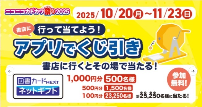 本の祭典「ニコニコカドカワ祭り2025」が後半戦へ!「行って当てよう!買って当てよう!」リアル書店で豪華プレゼントキャンペーン&店頭くじ引きがスタート! BOOK☆WALKERでの連動キャンペーンも