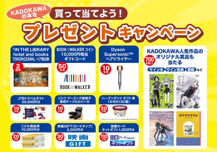 後半戦では、10月20日(月)から11月23日(日)まで全国のリアル書店にて、「行って当てよう!買って当てよう!アプリでくじ引き&プレゼントキャンペーン」を開催します。くじ引きキャンペーンでは、全国の対象書店で、KADOKAWAアプリを使ってくじ引きをすると、合計25,250(ニコニコ)名様に総額350万円以上の図書カードネットギフトが当たります。また、プレゼントキャンペーンでは、書籍を購入してためたポイントで応募すると、抽選で合計1,500名様以上にホテル宿泊券やハーゲンダッツ引換券などの豪華賞品や、KADOKAWA人気作品サイン本やサイン色紙などのオリジナル賞品が当たります。