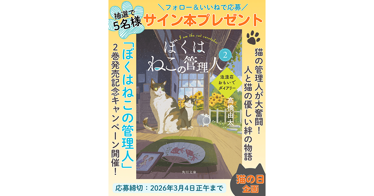 KADOKAWAは、2026年2月25日に『ぼくはねこの管理人2 浪漫荘おもいでダイアリー』(著/高橋由太 角川文庫刊)を発売予定です。これを記念して、「猫の日」である本日2月22日より、抽選で5名様に、著者・高橋由太さんの直筆サイン本が当たるInstagramプレゼントキャンペーンを実施します。