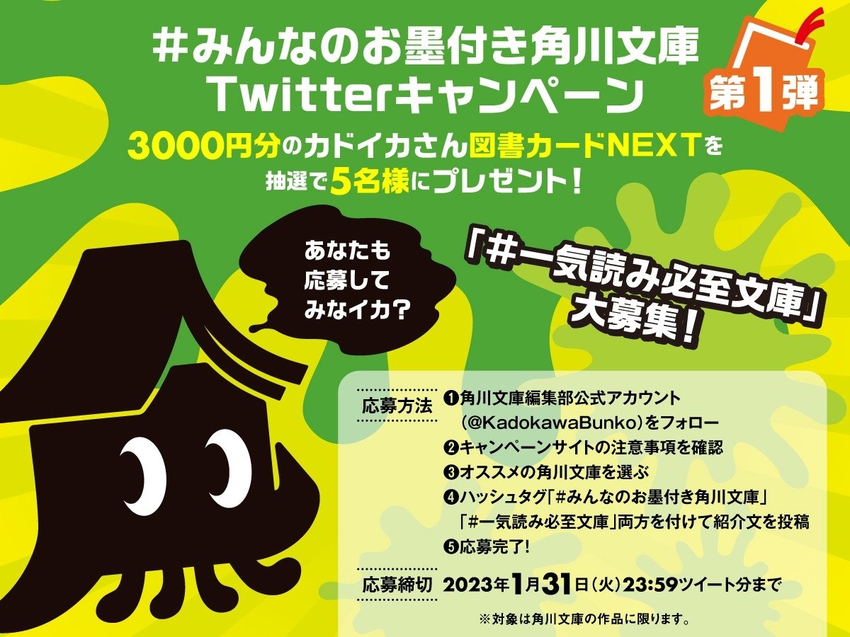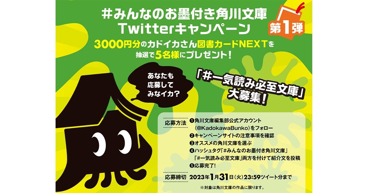 「角川文庫編集部」公式Twitterでは、2023年1月10日(火)より、みんなのお墨付き角川文庫を募集いたします。お題に合わせ、あなたのお気に入り・お墨付きの角川文庫をぜひ教えてください!