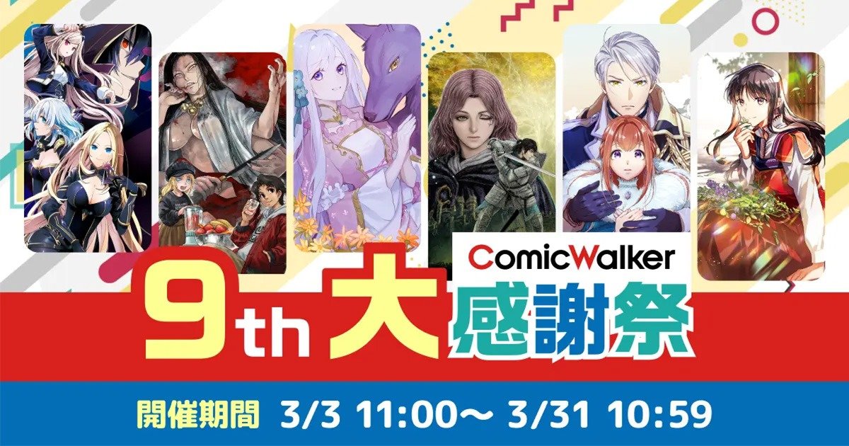 無料漫画サイト「ComicWalker」は、2023年3月22日に9周年を迎えます。話題の「異世界コミック」他、約4000作品以上の無料漫画が掲載されているComicWalkerから日頃の感謝を込めて、3月3日より「ComicWalker9周年 大感謝祭」を開催、あわせて豪華2大キャンペーンを実施いたします。