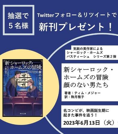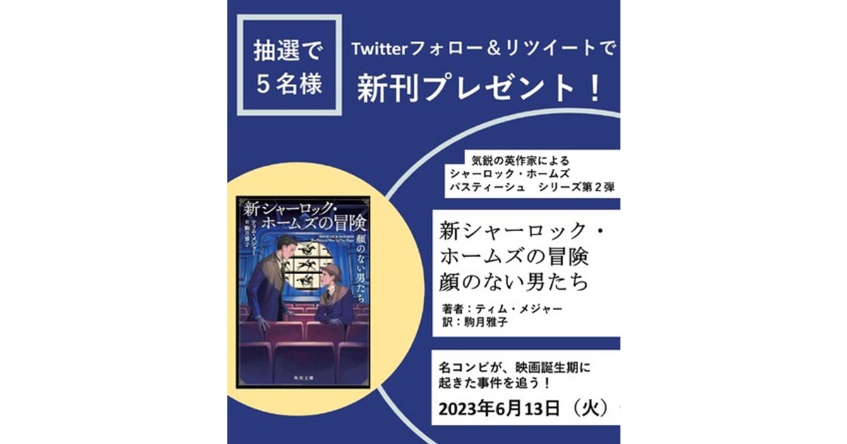 角川文庫で大人気のコナン・ドイル著「シャーロック・ホームズ」シリーズのパスティーシュ(模倣)作品にあたるティム・メジャー著、駒月雅子訳『新シャーロックホームズの冒険 顔のない男たち』が2023年6月13日(火)に発売! これを記念して、2023年6月8日(木)12:00よりTwitterで書籍のプレゼントキャンペーンを行います。