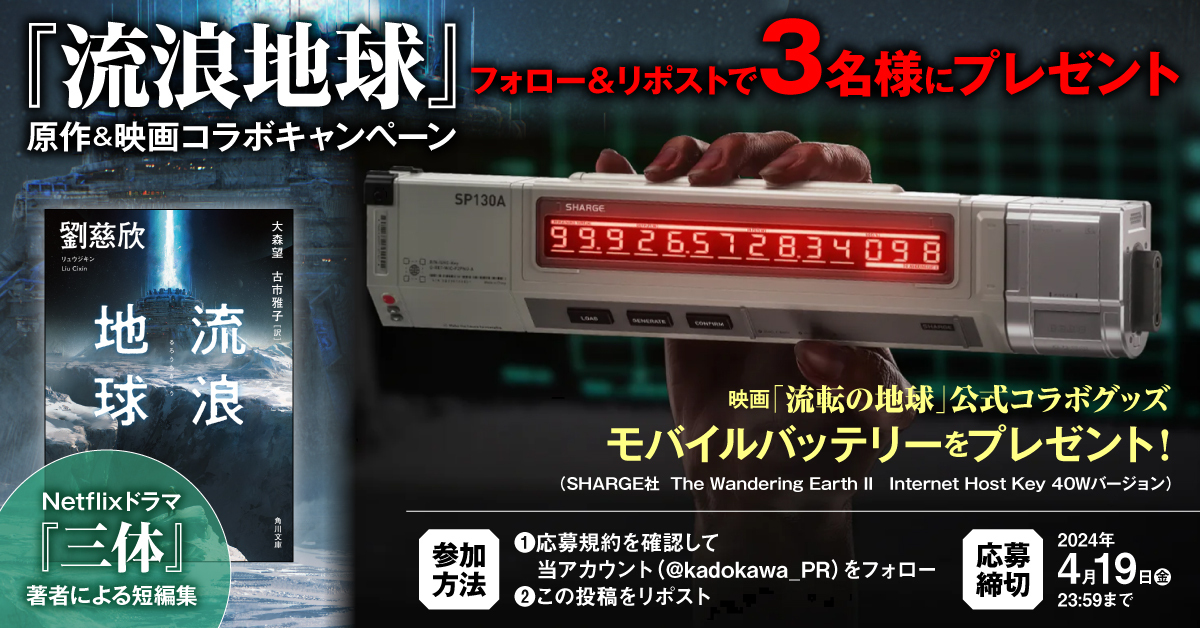 『三体』の著者・劉慈欣の短編「流浪地球」を原作とした映画「流転の地球 ー太陽系脱出計画ー」の大好評を記念して、KADOKAWA宣伝局公式アカウントをフォロー&リポストした方の中から抽選で3名様に公式コラボデザインのモバイルバッテリーをプレゼントします。