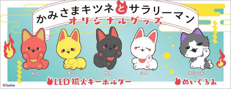32歳独身サラリーマンのコタローと4柱のかみさまキツネとの暮らしを描いた大人気マンガ『かみさまキツネとサラリーマン』。第2巻発売を記念して、著者であるヤシンさん監修のもと、オリジナルグッズの受注販売が決定しました。