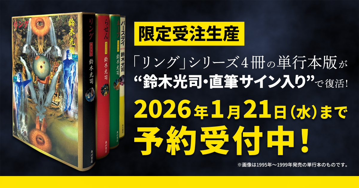 1991年6月に刊行され、世界中にジャパニーズ・ホラーブームを巻き起こした記念碑的作品『リング』。その刊行35周年&KADOKAWA創立80周年を記念して、シリーズ作品である『リング』『らせん』『ループ』『バースデイ』の横尾忠則装幀の単行本版が著者・鈴木光司の直筆サイン入りで限定復活します。