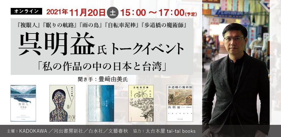 『複眼人』(KADOKAWA)『眠りの航路』(白水社)『雨の島』(河出書房新社)、そして『自転車泥棒』(文藝春秋)『歩道橋の魔術師』(河出書房新社)の文庫化と、邦訳/新刊が相次ぎ、まさに「呉明益Year」となった2021年。その最後を飾る版元四社主催のオンライントークイベントがいよいよ開催間近です!2018年にはブッカー国際賞候補にもなり、世界も注目する台湾作家の生の声が聞ける貴重な機会です。どうぞお見逃しなく!!