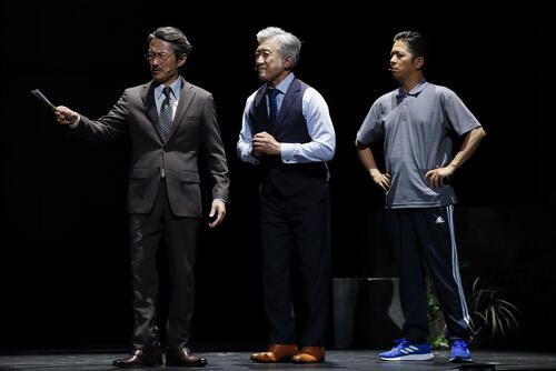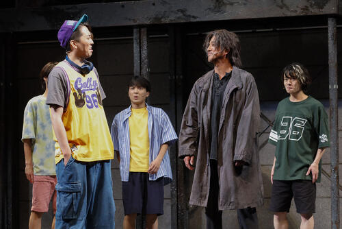幕開け前から劇場にはセミの声が鳴り響き、夏らしさ満載の演出が。程なくして幕が上がると、男性教師が持っていた竹刀を振り回しながら制服姿の中学生たちに威圧的な態度をとっている。原作に忠実に描かれる本作の舞台は1980年代。この頃はまだ学校での厳しい校則と教師による体罰がまかり通っていた頃だ。この日常風景に、中学1年生の菊地英治(田中)と相原徹(上遠野)の会話がナレーションで入ってくる。
