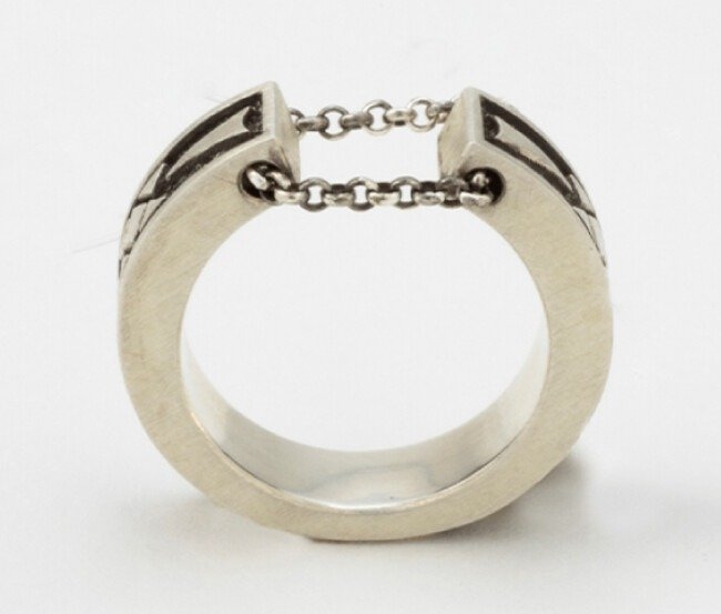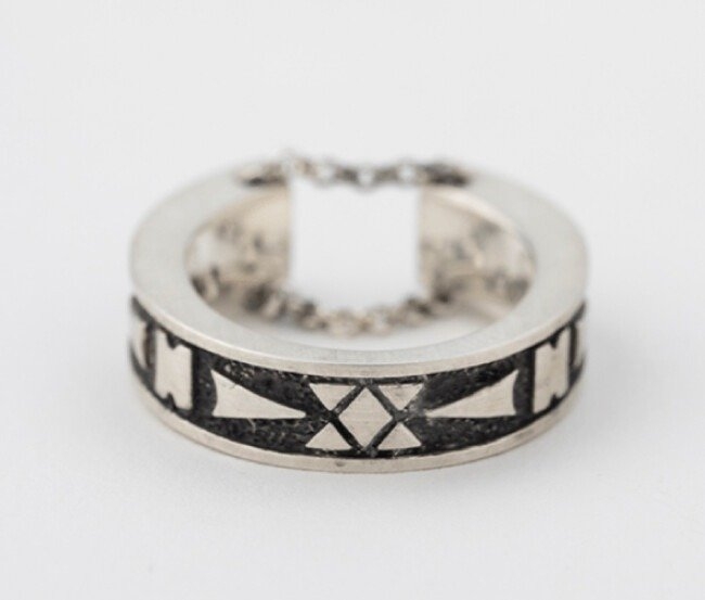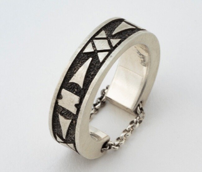 姉の琴子から妹の真琴へ受け継がれた、まもりの力が秘められた指輪。姉妹の母方の祖母がユタだったことから、デザインには沖縄固有の風習である「針突(ハジチ)」の模様を取り入れました。魔除けの意がある矢と、極楽に行けるという意がある五つ星が刻まれた神秘的なデザインです。また数々の死線を越えてきたであろう指輪のキズも加工を施すことで忠実に再現! 男女ともに着けやすく、その日の気分でチェーンの見える方を前にしても楽しめます。大切な人に贈るもよし、自分用として琴子の場面を再現してみるもよしの逸品です。