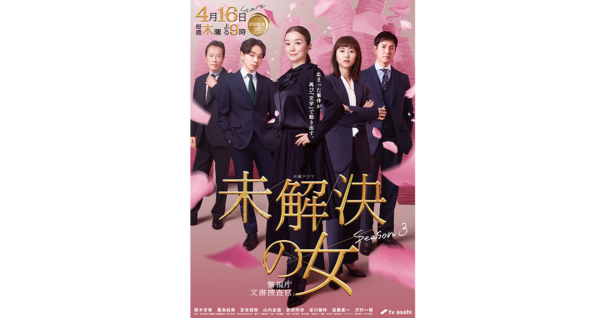 この《こだわりのメインビジュアル》を掲げ、いよいよ4月16日(木)から初回拡大スペシャルをもってスタートするSeason3。6年の時を経て再び動き出す『未解決の女』に、ぜひご期待ください。