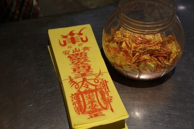 ▲艋舺青山宮にあった御札。右の瓶に入っているのは手前の御札を折りたたんだもの。折りたたんだ御札を専用のケースに入れれば、お守りにもなる。