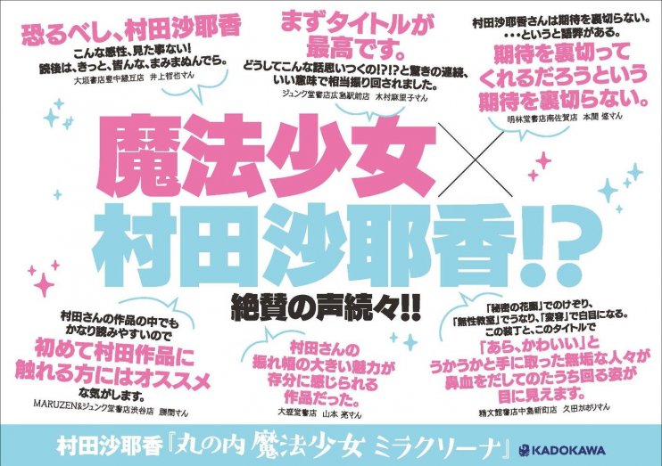 KADOKAWAは、2020年2月29日(土)に発売しました、作家・村田沙耶香さんの最新短編集『丸の内魔法少女ミラクリーナ』(https://www.kadokawa.co.jp/product/321903000373/)に早くも絶賛の声が続々と届いています。理不尽な世界と闘うすべての人に贈る、魔法のコンパクト『丸の内魔法少女ミラクリーナ』ぜひご一読ください。