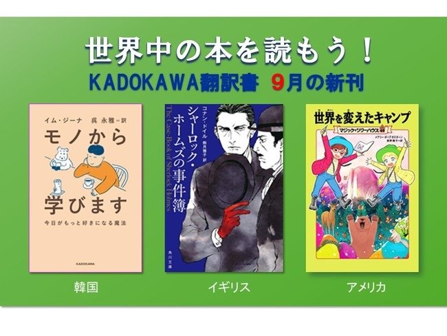 KADOKAWA翻訳書9月の新刊は、韓国の人気エッセイ『モノから学びます』、シリーズ完結『シャーロック・ホームズの事件簿』、大人気児童書『マジック・ツリーハウス49 世界を変えたキャンプ』の3作!