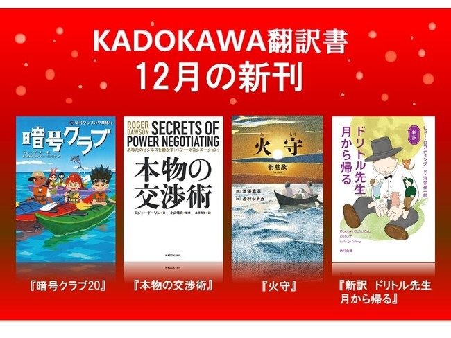 KADOKAWA翻訳書・12月の新刊は、大人気児童書『暗号クラブ』第20巻、全米ベストセラー『本物の交渉術』、中国から物語絵本『火守』、シリーズ第9巻『新訳 ドリトル先生月から帰る』の4作!