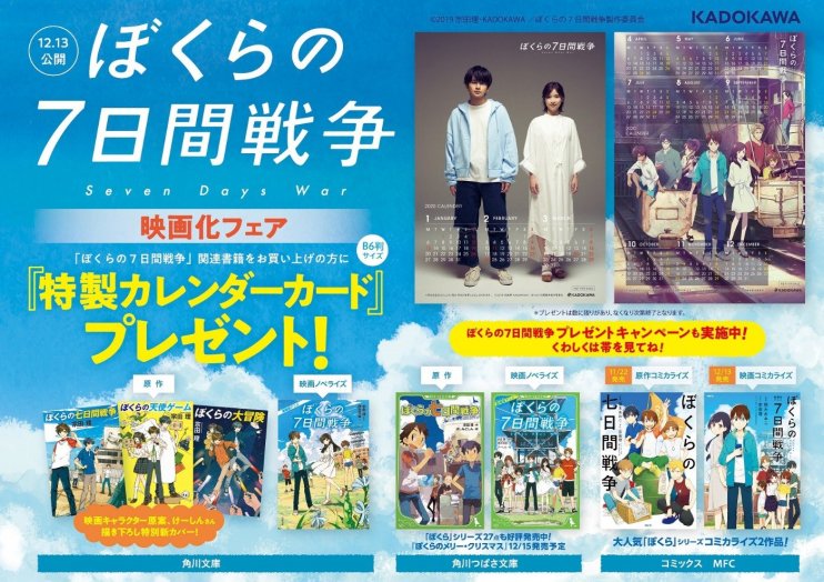 上記9店舗含む、映画「ぼくらの7日間戦争」応援店では関連書籍をお買い上げの方に、「特製カレンダーカード」(B6判サイズ)をプレゼントするフェアを行っています。「特製カレンダーカード」は、キャストの北村匠海さん、芳根京子さんの写真や、映画キービジュアルを使った限定品です。*プレゼントは数に限りがあり、なくなり次第、フェアは終了になります。