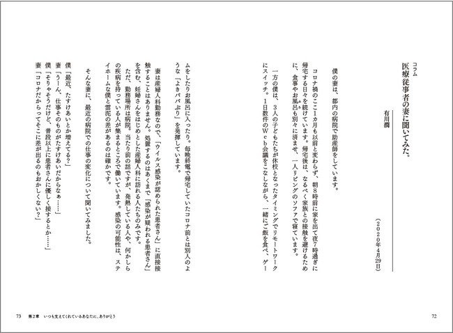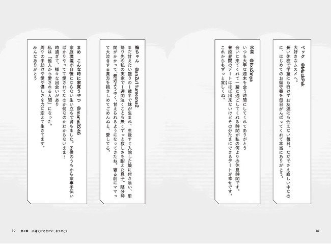 2020年、世界を覆った新型コロナウイルスは日常の生活を一変させましたが、先行きが見えない状況が続く中で気づくことができたことがあります。それは、肉親、子ども、パートナー、友人、医療従事者、ペットまで、いつもの日常を支えてくれる人たちへの感謝の気持ち――そんな大切な気持ちを残すため、こくみん共済 coopが「#今できるたすけあい」プロジェクトを通じてツイッターで募集した「ありがとうの手紙」が、一冊の本にまとまりました。