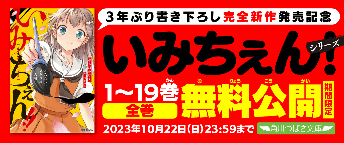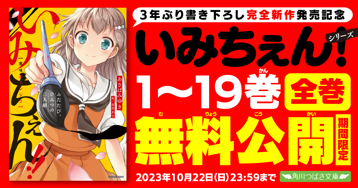 KADOKAWAは、大ヒットシリーズ待望の最新刊『いみちぇん!! ふたたび、ひみつの二人組』を10月12日(木)に発売しました。発売を記念して、Web上で「いみちぇん!」シリーズ1~19巻の【全巻無料公開】を実施します(~2023年10月22日(日)23:59まで)。