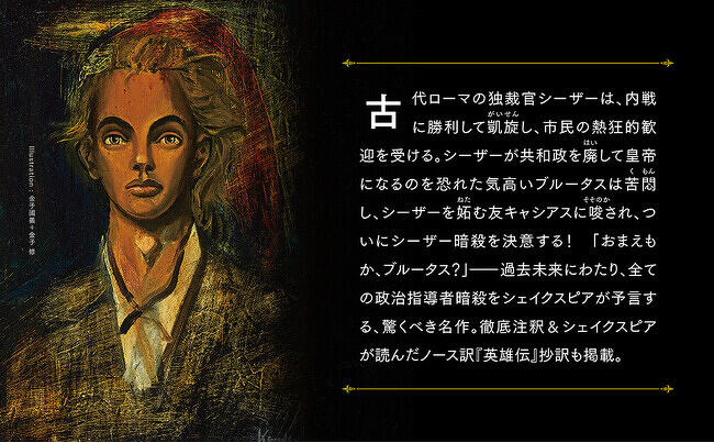 また、作品を理解するのに不可欠な、訳者による徹底した注釈と、シェイクスピアが読んだノース訳『英雄伝』の抄訳も掲載されており、すでに『ジュリアス・シーザー』を読んでいる読者にとってもお得でスペシャルな1冊となっています。