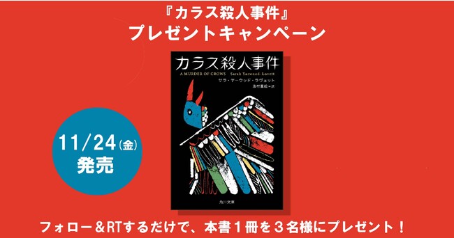 生き物トリビア満載の超絶ミステリ『カラス殺人事件』(サラ・ヤーウッド・ラヴェット 訳/法村里絵)が角川文庫より発売! 発売を記念して、2023年11月20日(月)12:00よりX(Twitter)で書籍のプレゼントキャンペーンを行います。