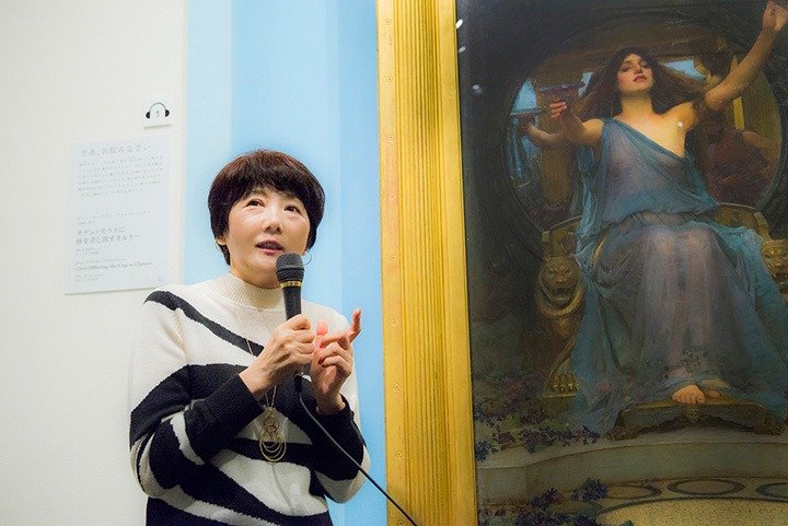 まず、「オデュッセウスに杯を差し出すキルケー」(ジョン・ウィリアム・ウォーターハウス)の前へ。魔女キルケーに魔酒を飲まされ、豚に変えられてしまった部下たちを探しにきたオデュッセウス。彼とキルケーの出会いのシーンが描かれている。中野さんは「豚が何頭いるかわかりますか?」と質問したり、「知人男性が、展覧会の中でこの絵が一番怖いと言っていました。豚に変えられるとわかっていても、美人に勧められたら絶対に飲んでしまうから、ですって!」とエピソードをはさんだりしながら、軽快に解説を続ける。