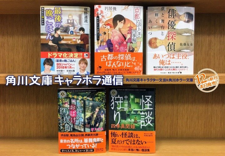この「キャラホラ通信」では、角川文庫キャラクター文芸&角川ホラー文庫の新刊を毎月ご紹介していきます。今月の注目作は2018年1月よりドラマがスタートする「最後の晩ごはん」シリーズ最新刊! ホラー文庫では「華舞鬼町」シリーズの第二弾が登場です。来年1月発売予定作もお楽しみに!