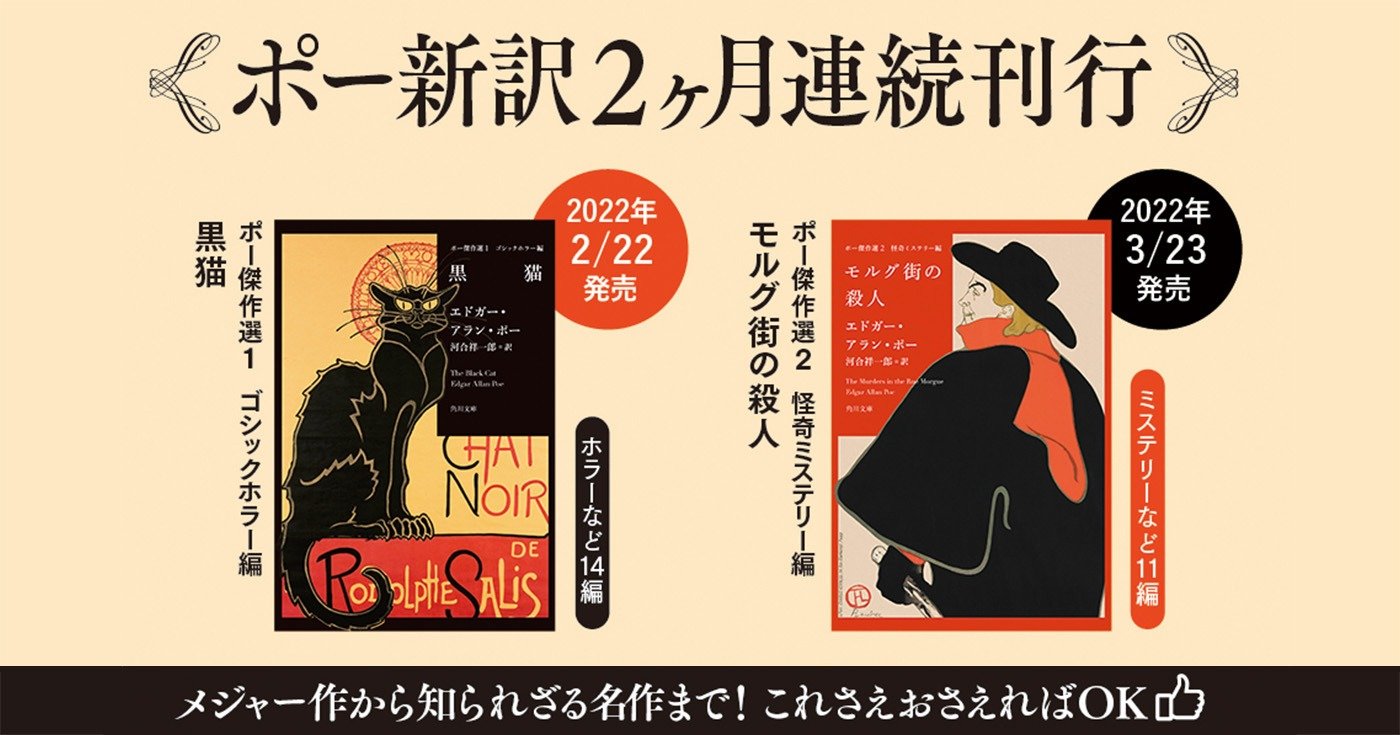 河合祥一郎による、エドガー・アラン・ポー新訳『ポー傑作選1 ゴシックホラー編 黒猫』が先月に発売されました。また3月23日(水)に『ポー傑作選2 怪奇ミステリー編 モルグ街の殺人』も発売されます。