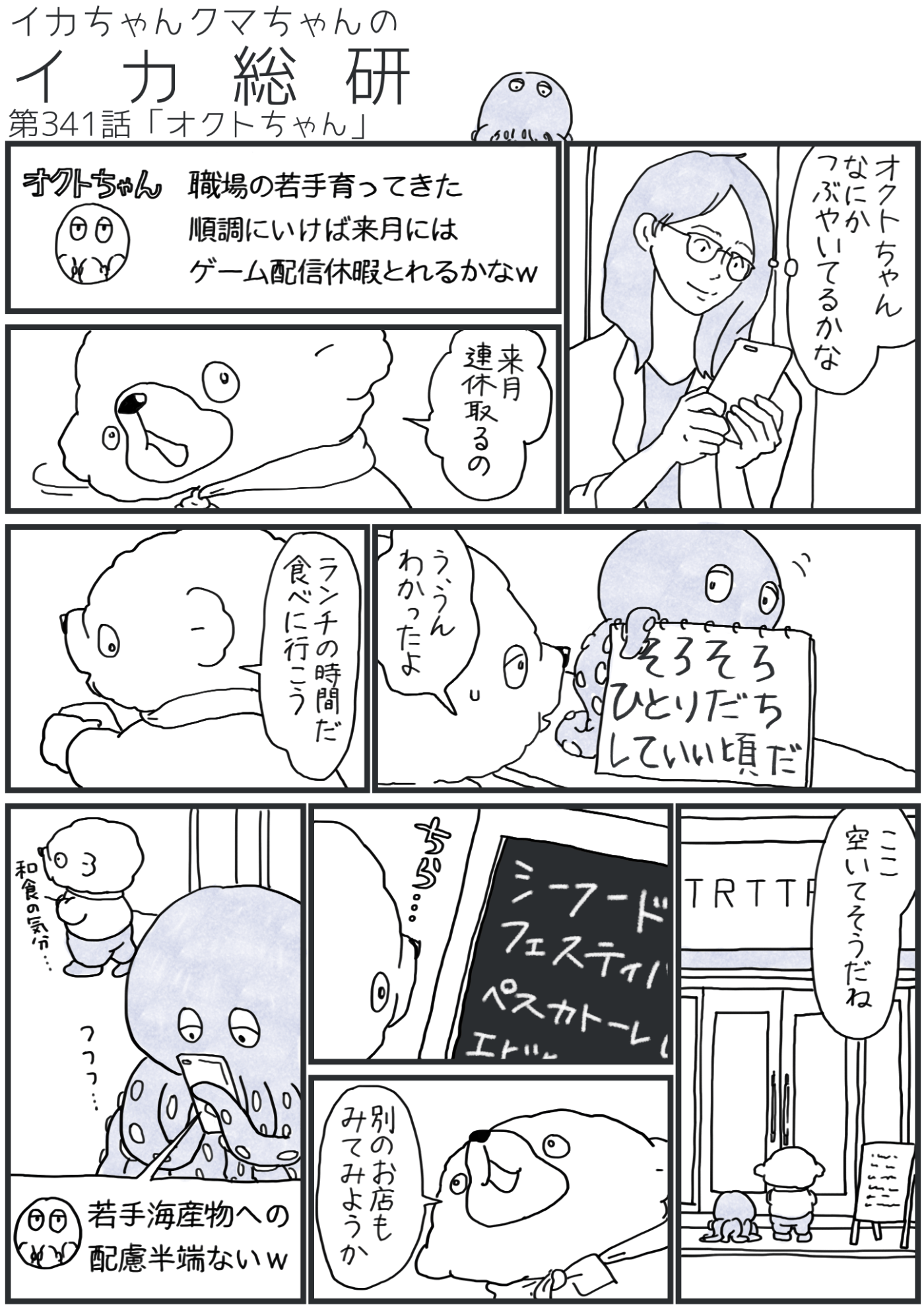 上から目線の奔放イカちゃんと真面目すぎるおっとりクマちゃんのほんわかコンビがお互いを思いやりながら東京のど真ん中でよく働き楽しく暮らす漫画です。