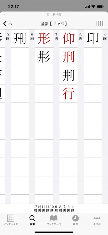 廣瀬:基本の検索はやっぱり書籍版と同じで、音訓と部首や画数の組み合わせです。ただアプリの場合は一度の入力で様々な検索をすることができますし、目当ての字を見つけてから該当ページに飛ぶのも一瞬です。その点では便利ですよね。アプリの個性もそのあたり(書籍版以上の部分)に出るので、いろいろ比較して自分に合う、合わないで選ぶ方もいます。