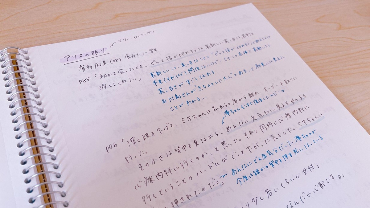 今回のノートでは作品のイメージに合わせ、各章(各短編)のタイトルに薄紫のマーカーを引いてみました。心に残った表現、気になった表現には水色のマーカーを引いています。そして、気になった理由やそのとき思ったことはブルーのボールペンで書き込みました。