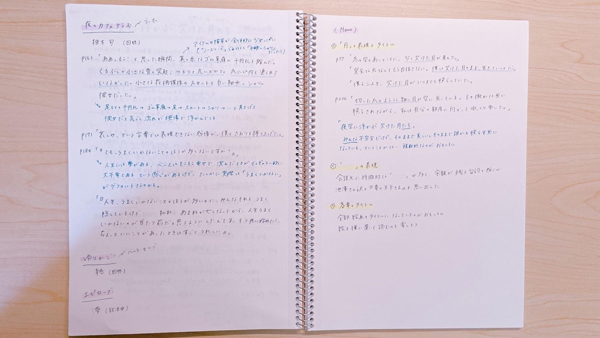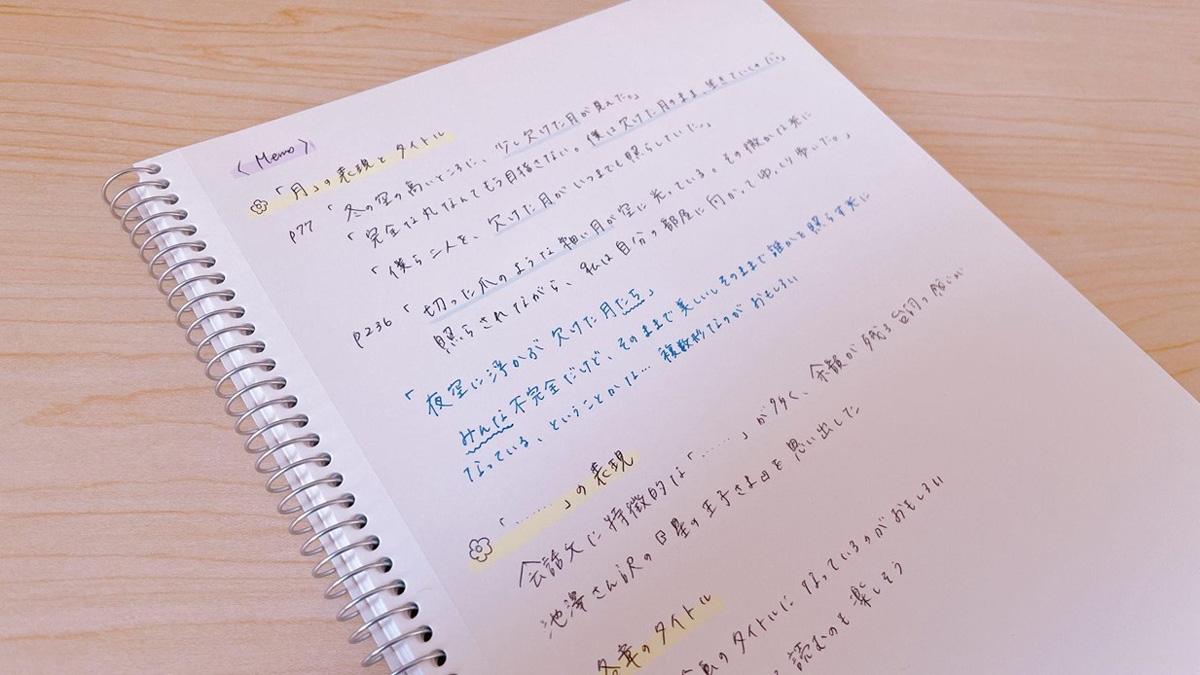 今回は、「『月』の表現とタイトル」「『……』の表現」「各章(各短編)のタイトル」について思ったことをそれぞれ書いています(ちなみに、「月」のイメージに合わせて淡めのイエローのマーカーを使ってみました)。