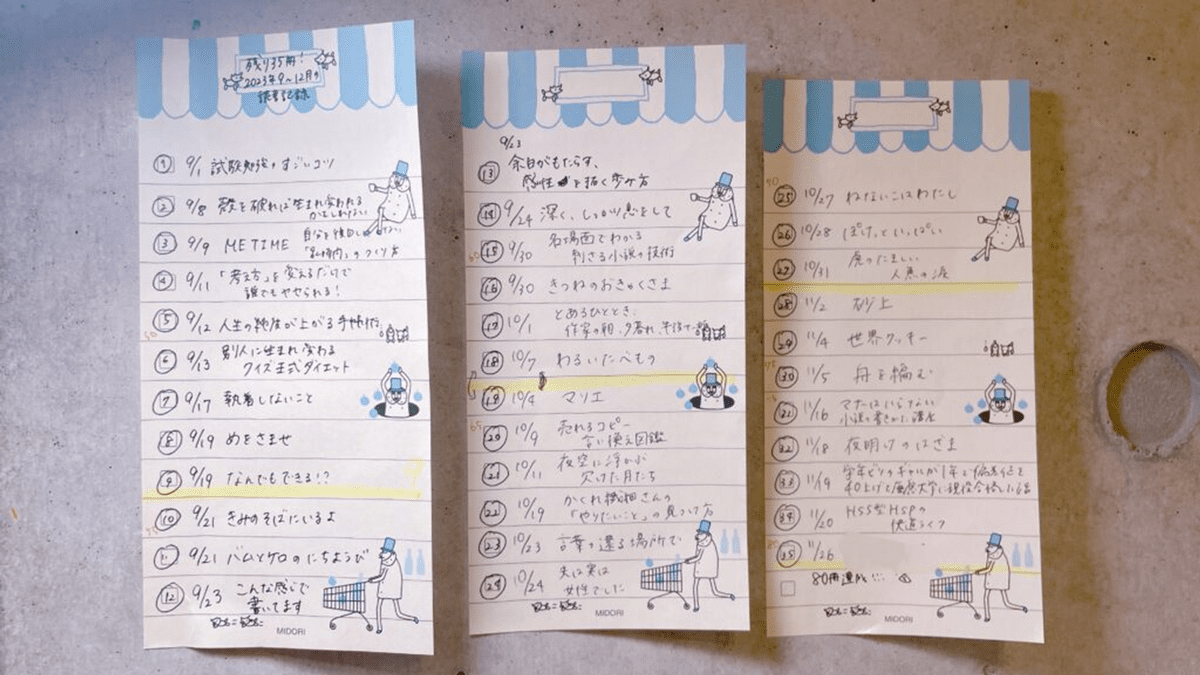 そこで活用したのが、写真にある「やることふせん」です。本来はToDoリストを作るのに使うふせんですが、9月から読んだ本のタイトルを、読了日とあわせて書き込むことにしました(読書メーターのアプリも併用)。