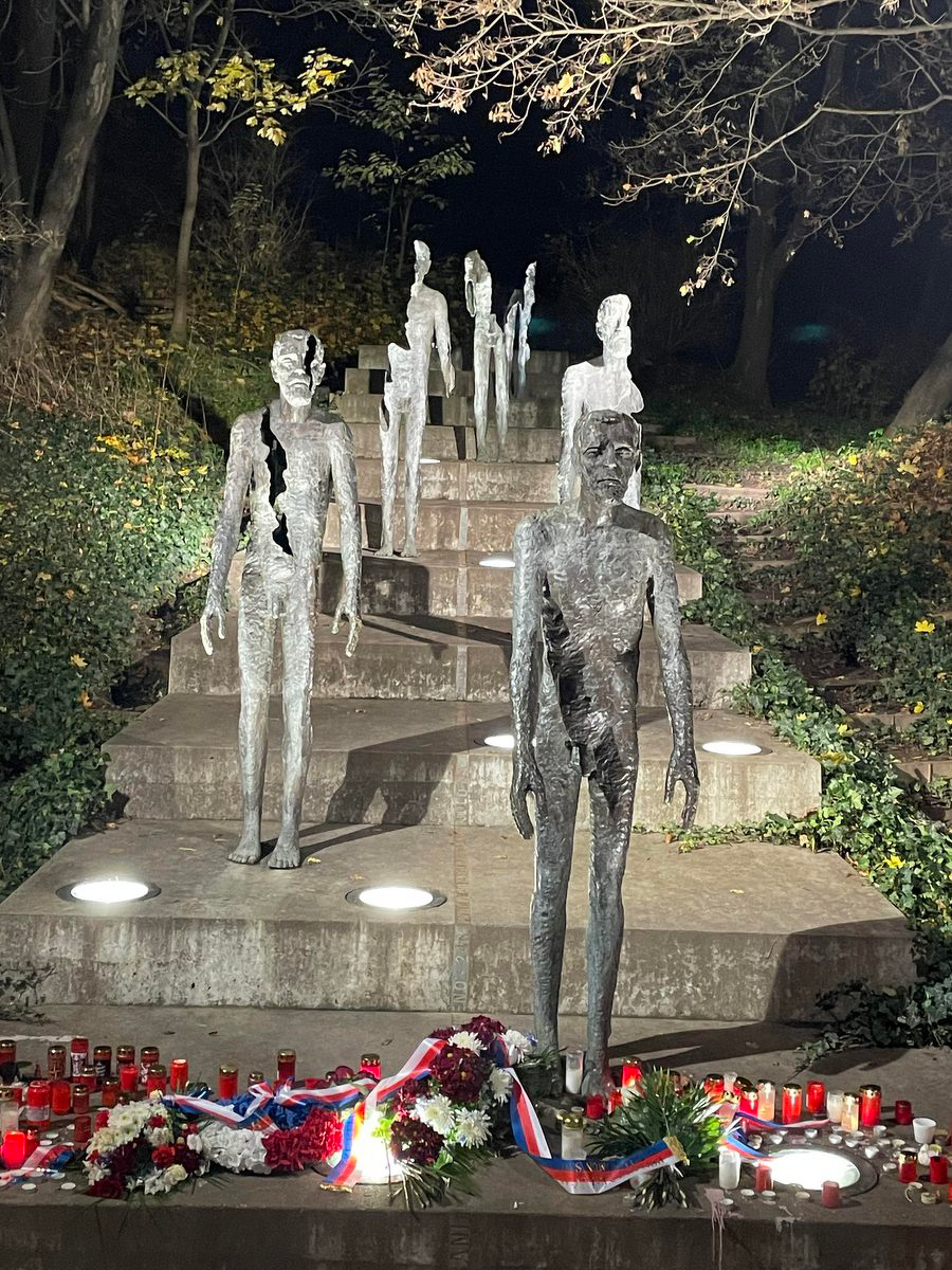 そこから少し歩いて、〈共産主義の犠牲者たち〉(127章)の前へ。作中では「ヨーロッパで最も不気味で印象的な芸術作品」と説明される。夜のライトアップのなかだと、たしかに恐ろしい。同じ人物が、日を重ねて後ろへ行くほど体を磨り減らして、最後は消えてしまう様子を表している。前に花やキャンドルがたくさん置かれているのは、ちょうど前日の17日がビロード革命を記念する重要な祝日(自由・民主主義闘争記念日)だったからだという。この国の複雑な歴史がこの1枚に凝縮されている気がしてならない。